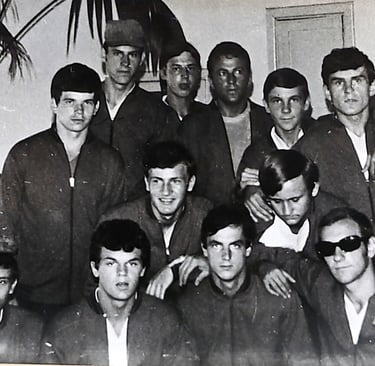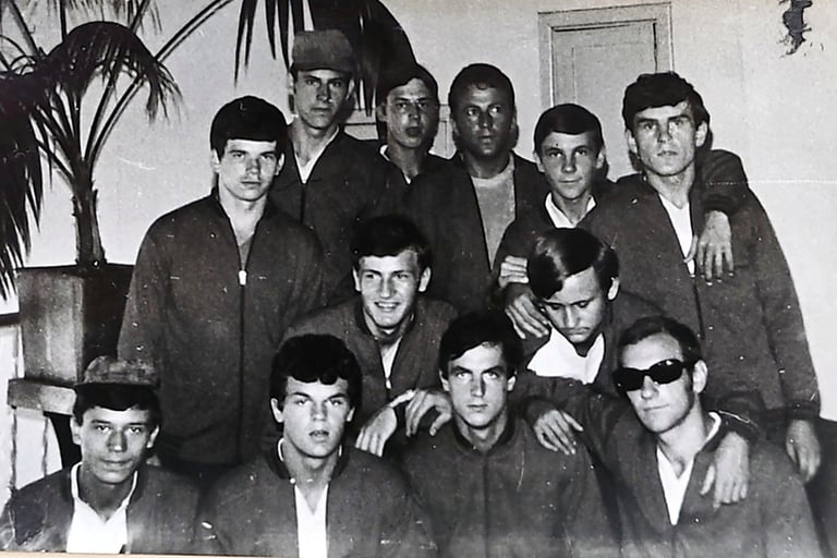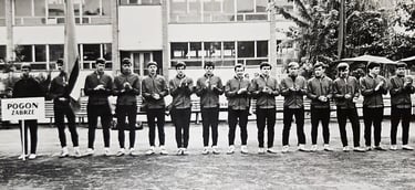 od lewej: Zygmunt Michalski (z flagą), Wojciech Gwóźdź, Joachim Twardawa, Stanisław Gogolewski, Andrzej Niemiec, Marek Tymowicz, Zdzisław Wiśniewski, Eugieniusz Brzeski, Andrzej Igielski, Tadeusz Płuska, Norbert Ryszka, Jerzy Kilka, Stanisław Kopka