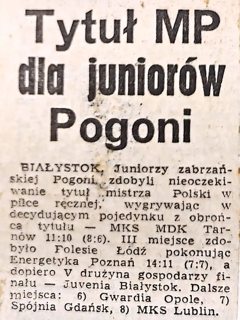 Był to historyczny rok – zawodnicy sekcji młodzieżowej piłki ręcznej „Pogoni” Zabrze zdobyli wówczas jednocześnie medale w kategorii juniorów starszych (złoto) oraz młodszych (brąz). Marek Tymowicz, Stanisław Kopka, Zygmunt Michalski, Joachim Twardawa, Stanisław Gogolewski oraz Norbert Ryszka zostali dwukrotnymi medalistami. Z kolei Krystian Nawrotek dołączył do kolegów ze złotej „siódemki” i po zakończeniu wieku juniora występował również w pierwszym zespole seniorów. Marek Tymowicz jako reprezentant Polski juniorów, poświęcił dobrze zapowiadającą się karierę sportową na rzecz kariery zawodowej.